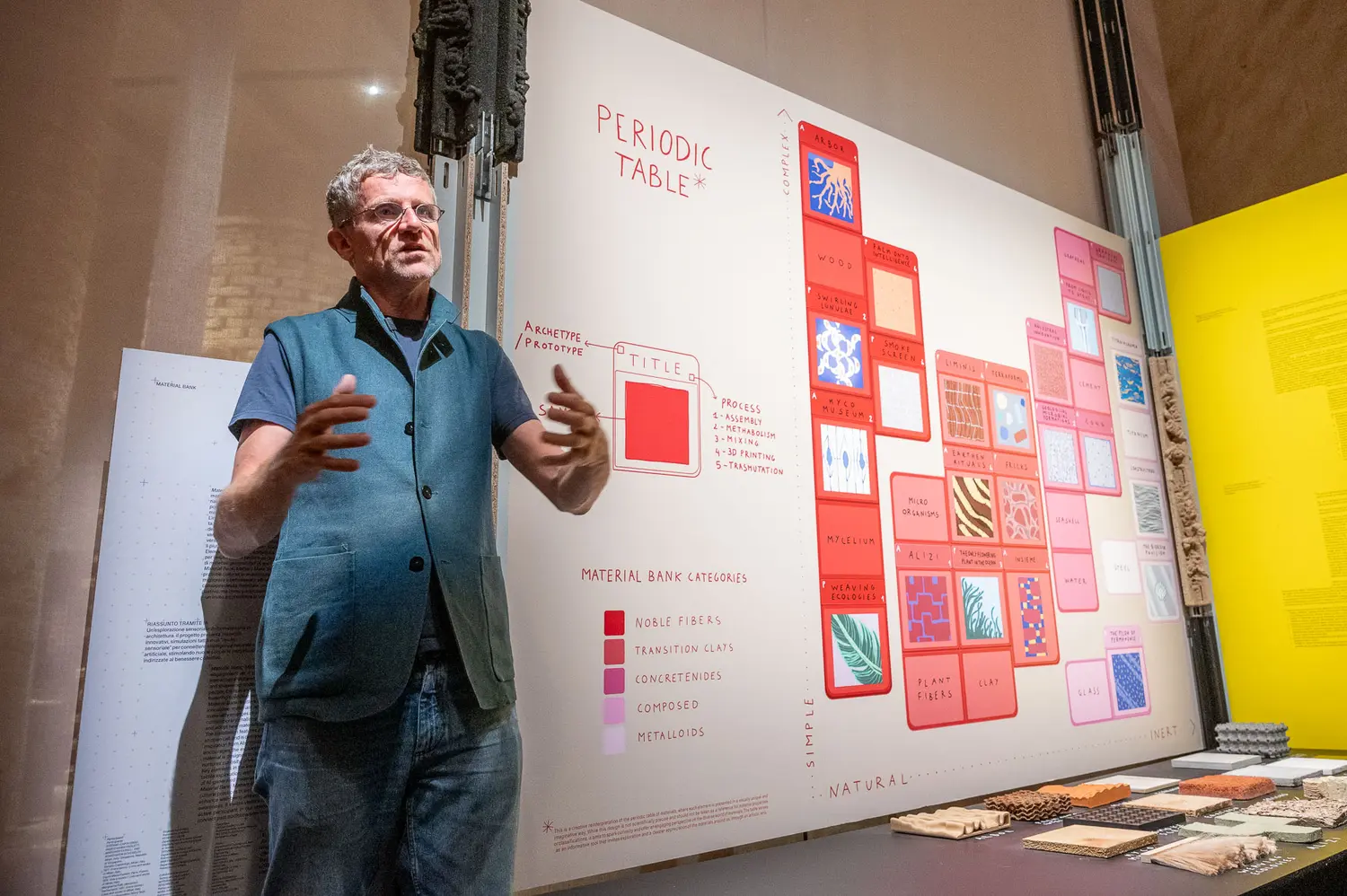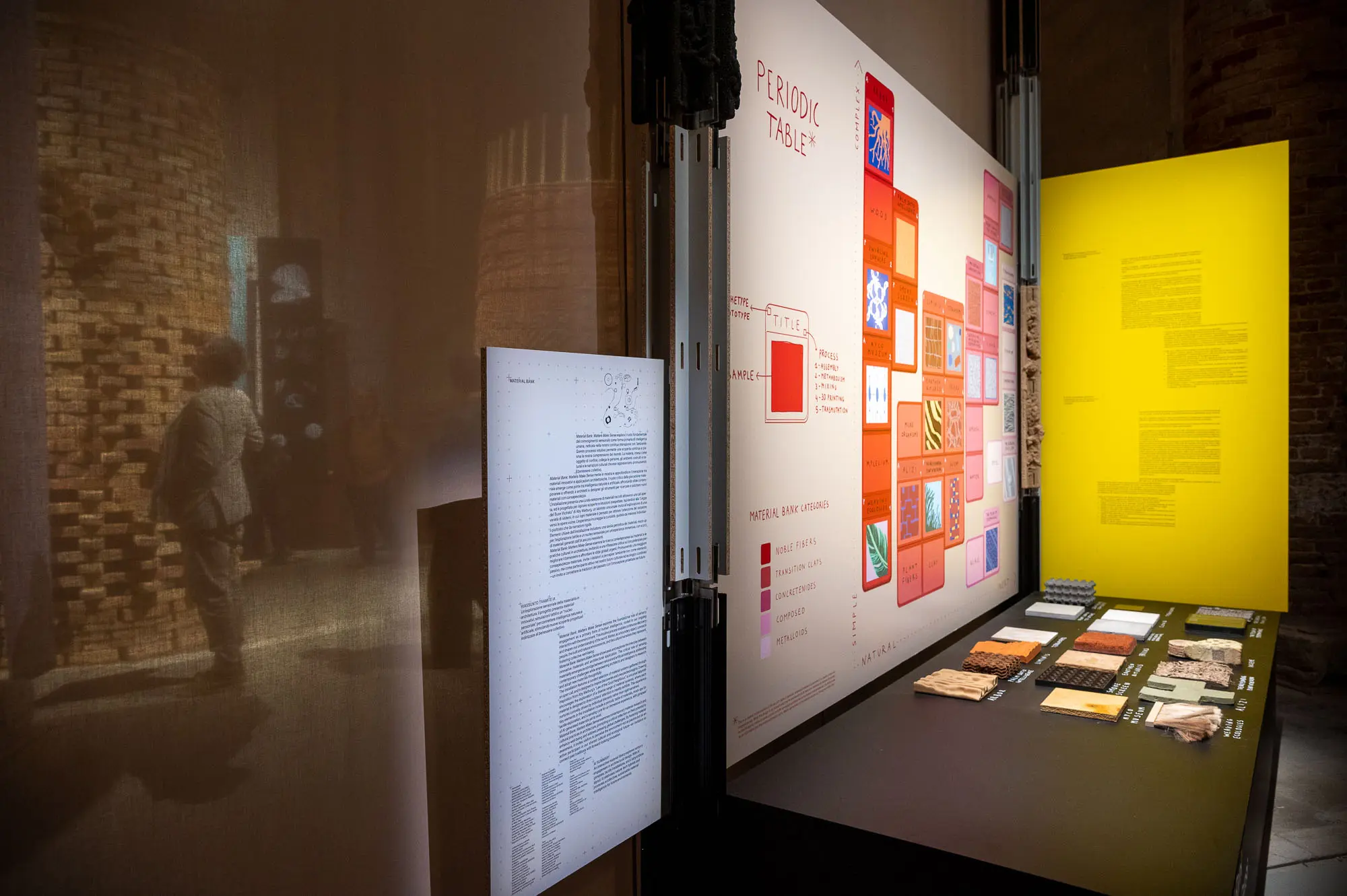 Key elements of the exhibition include a periodic table of materials, mock-ups for multisensory exploration, and a central core for an immersive experience, as well as a concluding look at materials that do not yet exist, generated by artificial intelligence.