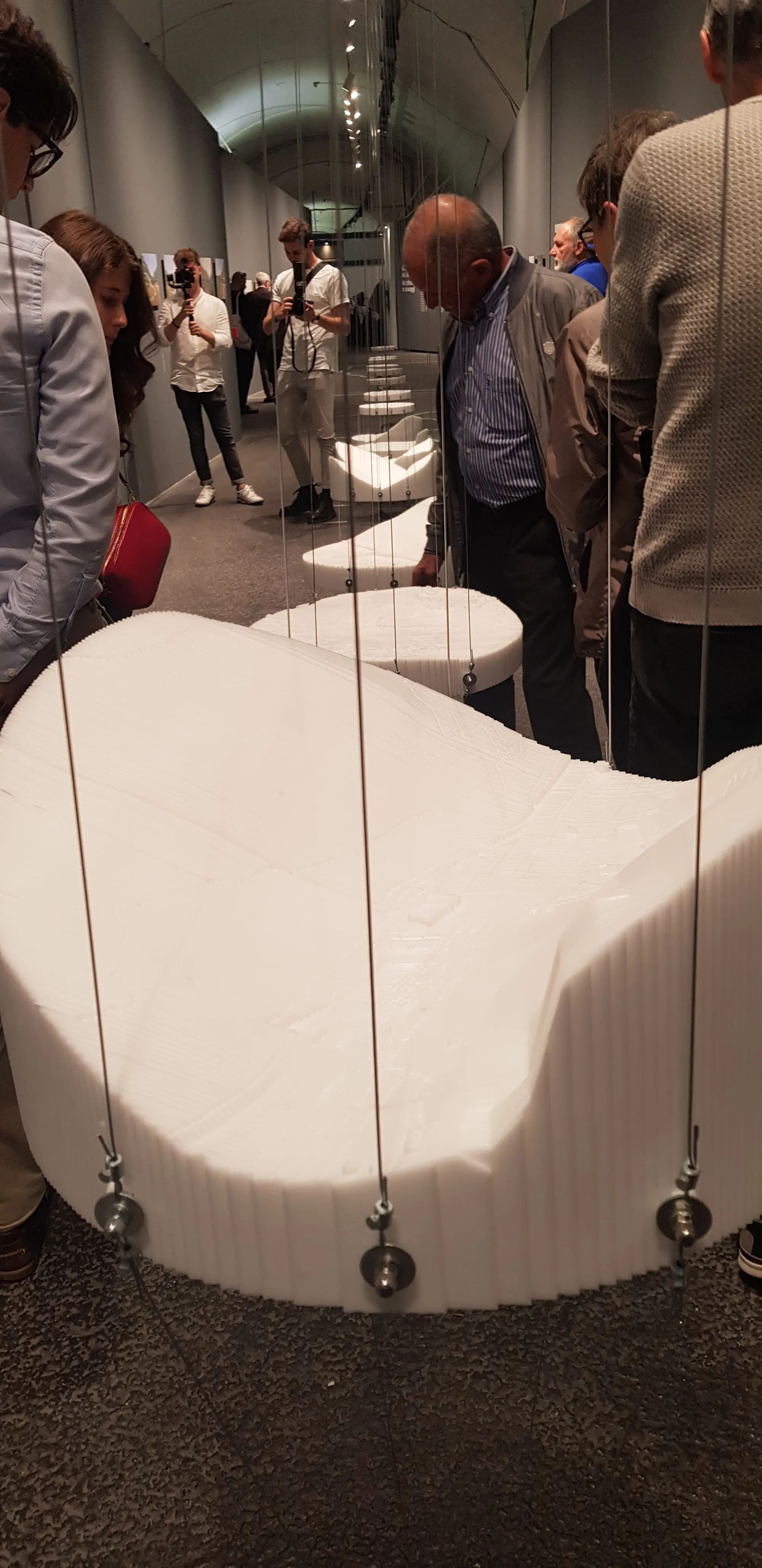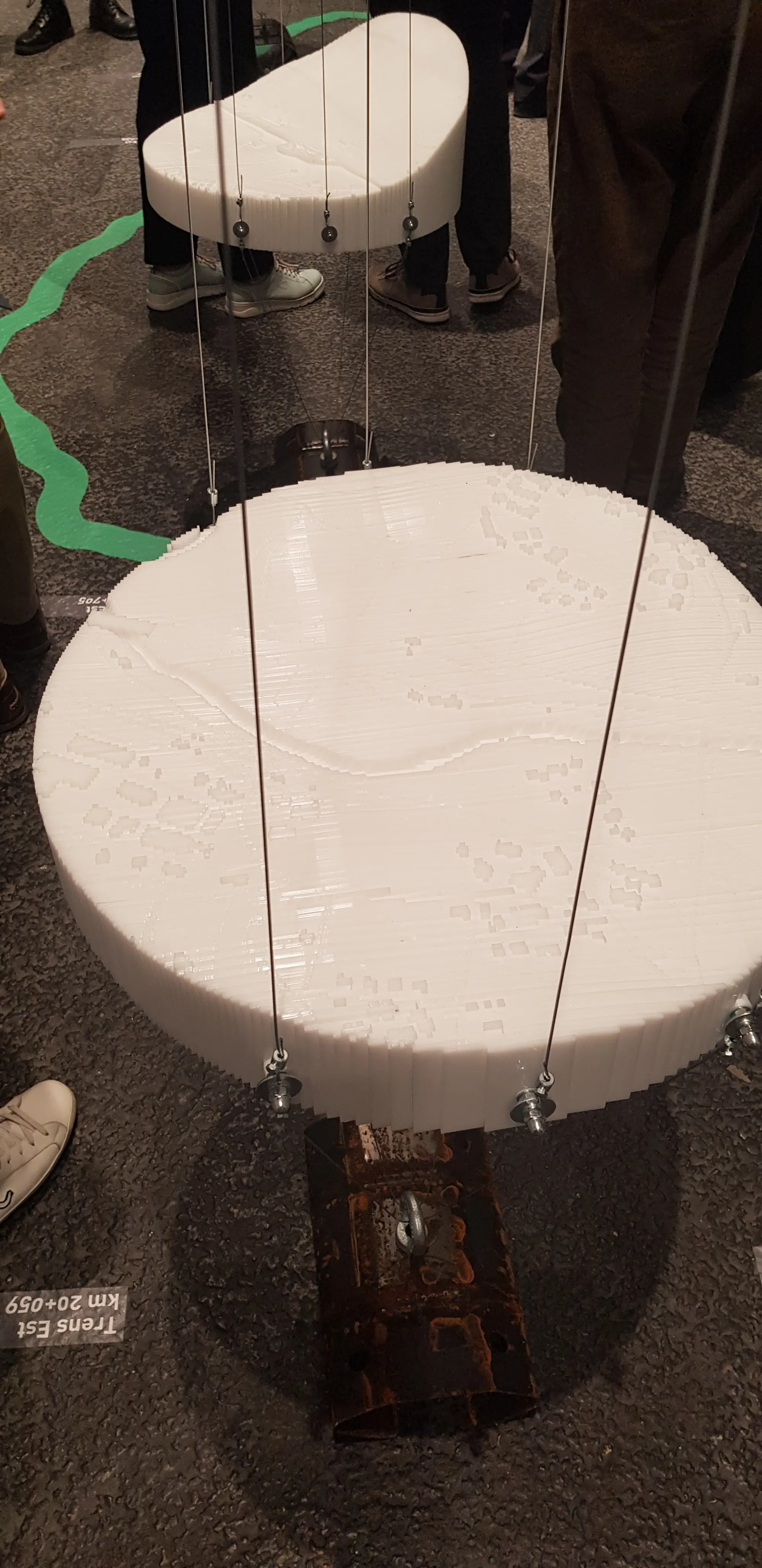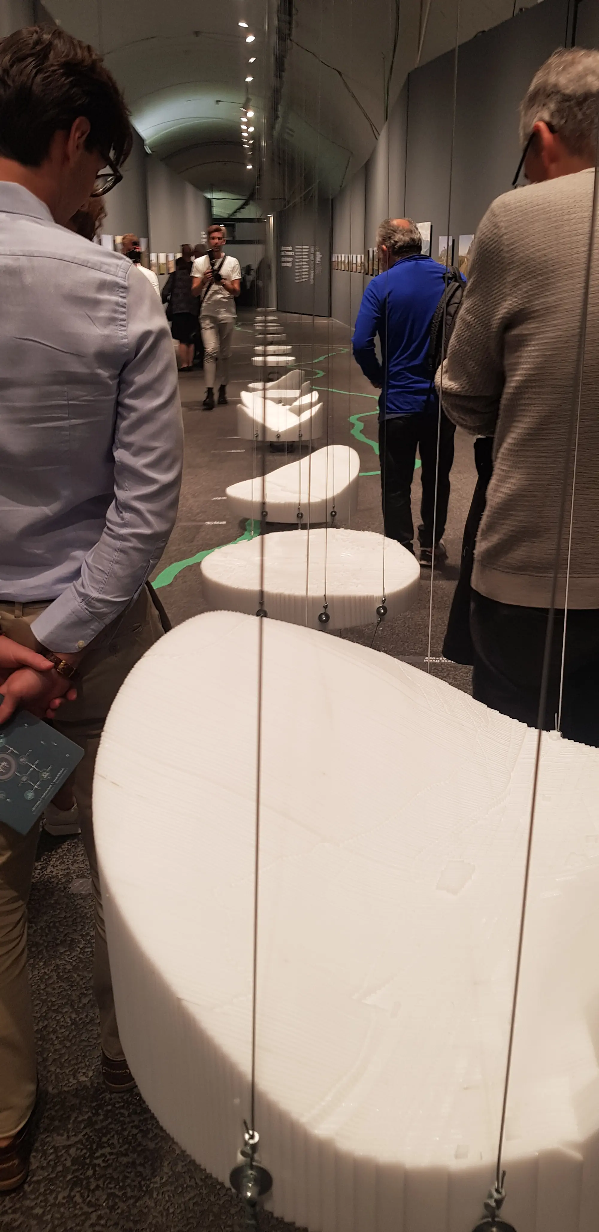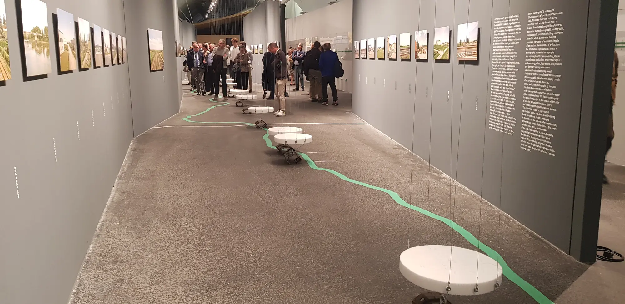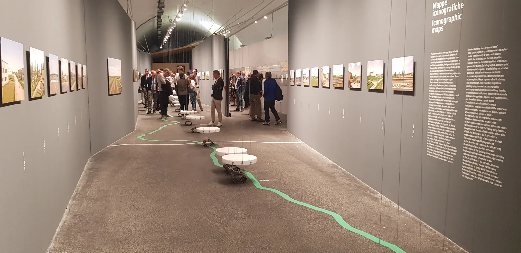 Tra gli elementi esposti, spiccano sezioni di paesaggio realizzate con taglio laser su supporto acrilico, che rappresentano in modo dettagliato il territorio lungo il tracciato autostradale. Gli elementi espositivi raffigurano dei dettagli circolari del paesaggio, ogni elemento è composto da una serie di pannelli tagliati al laser ed incollati tra loro, ognuno dei quali rappresenta una sezione paesaggistica.