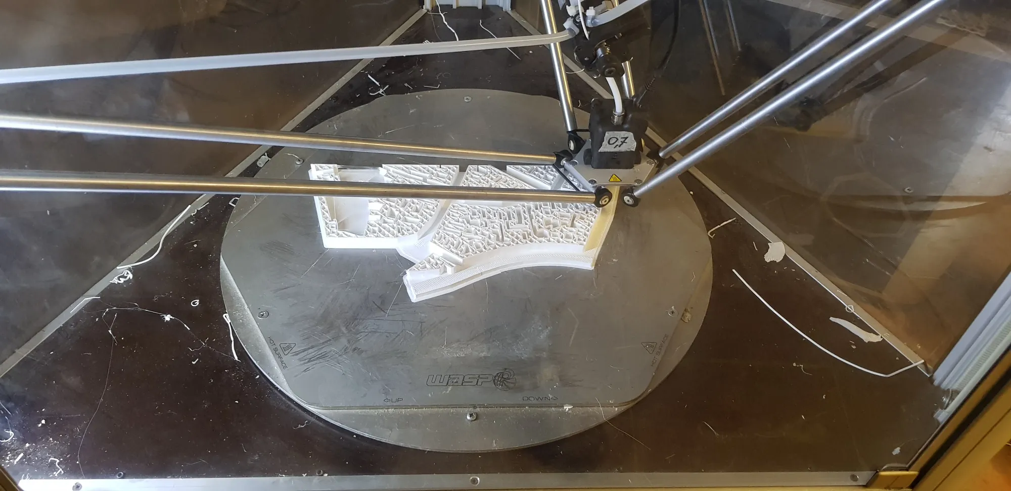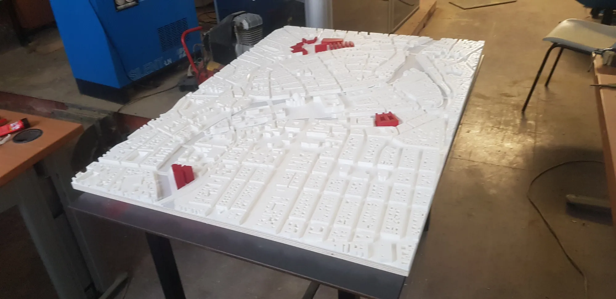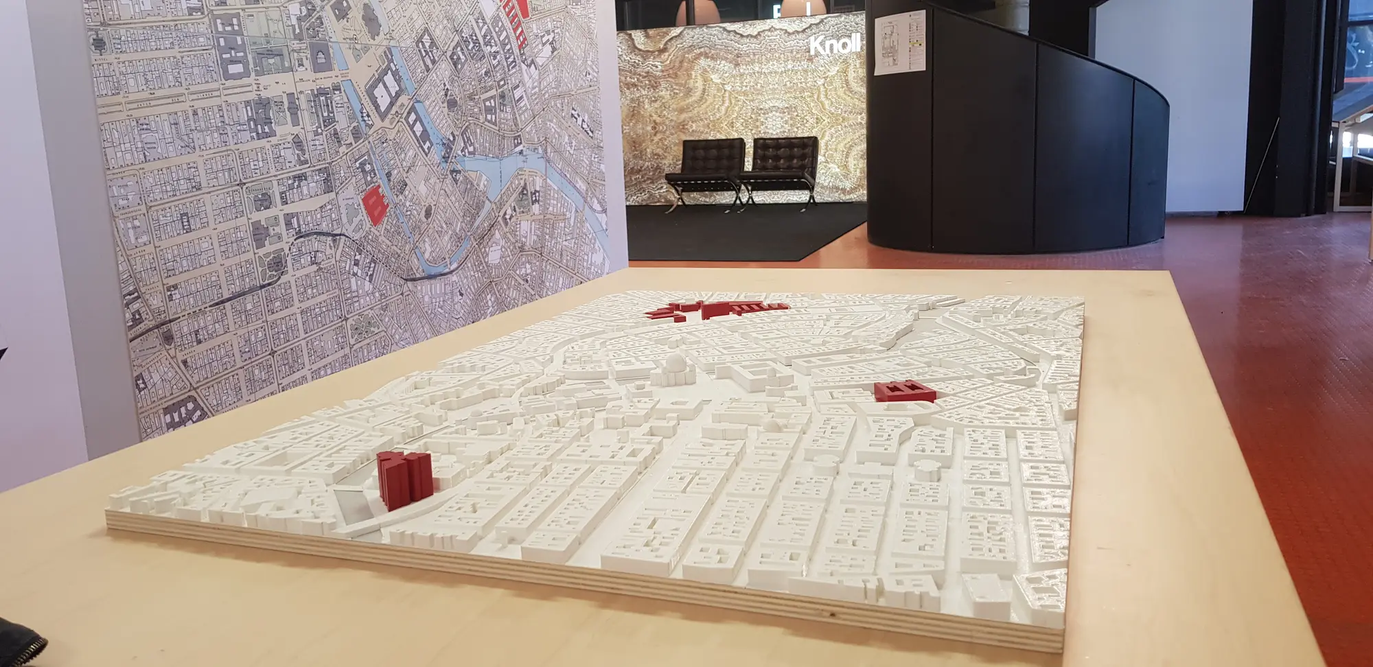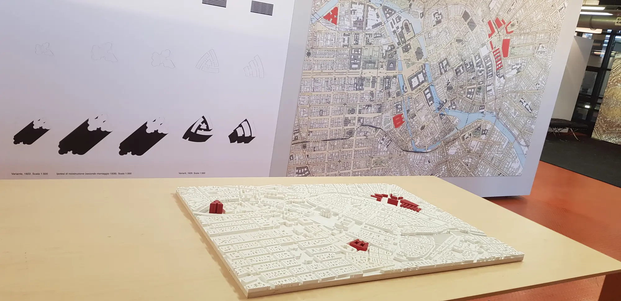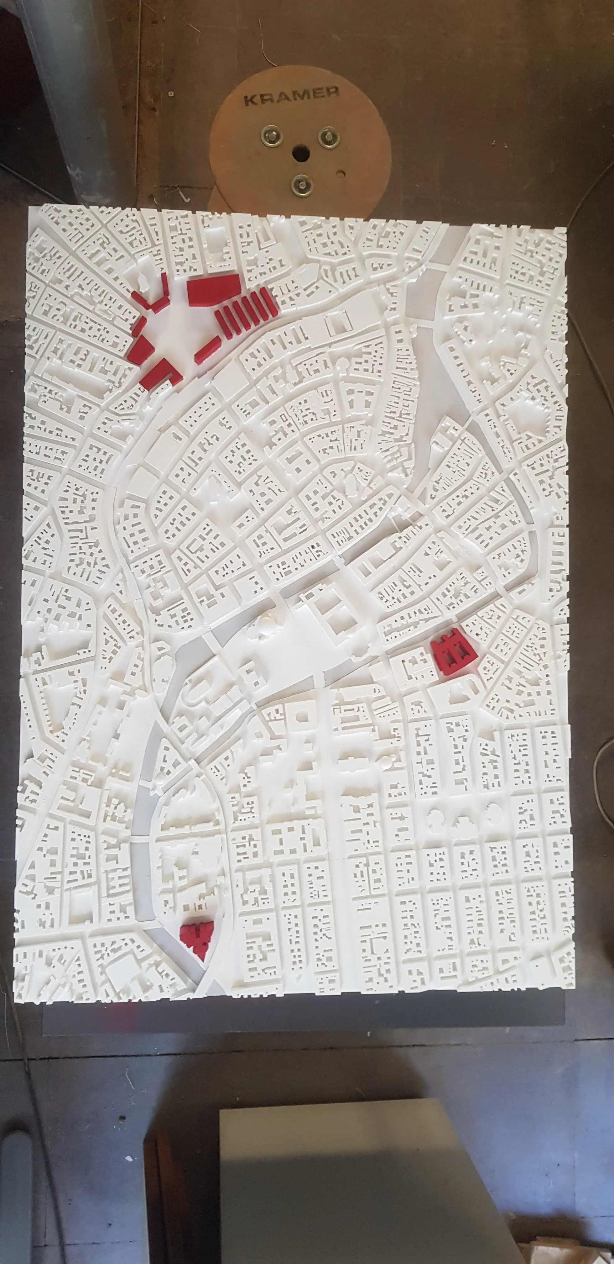 E’ stato realizzato un modellino di una porzione della città di Berlino, mettendo in evidenza, con il colore rosso, tre edifici progettati dell’architetto. Il modello è stato realizzato attraverso la stampa 3D (WASP 40x70) di diversi isolati della città, puoi uniti insieme per ultimare il modello.